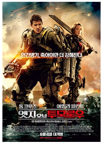 액션영화를 좋아하신다면 톰크루즈의 액션 영화 많이 좋아 하실 것입니다. 영화 엣지 오브 투모로우는 톰크르즈의 몸을 사리지 않는 액션을 아낌 없이 볼수 있는 영화 입니다. 탄탄한 소재와 깔끔하게 떨어지는 스토리 라인과 더불어 sf 영화에 걸맞는 화려한 CG는 돈을 내고 보는 관객이라면 돈과 시간이 아깝지 않을 정도로 잘만들어진 수작입니다.